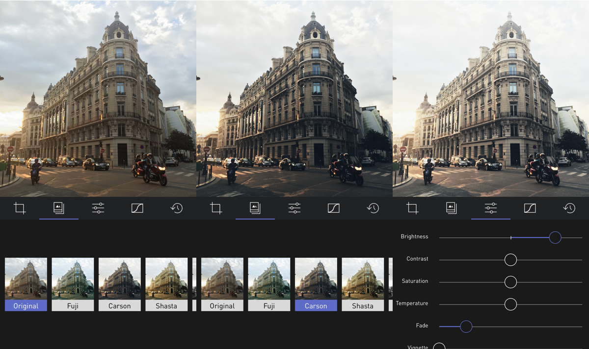 The inefficiency here is pretty evident, and one of the core reasons why we started Darkroom. In Darkroom, all your photos are always there, no-import needed. Further more, getting in an out of a photo is as easy as a tap, and a swipe down. While you’re editing, you can swipe back and forth through your library.