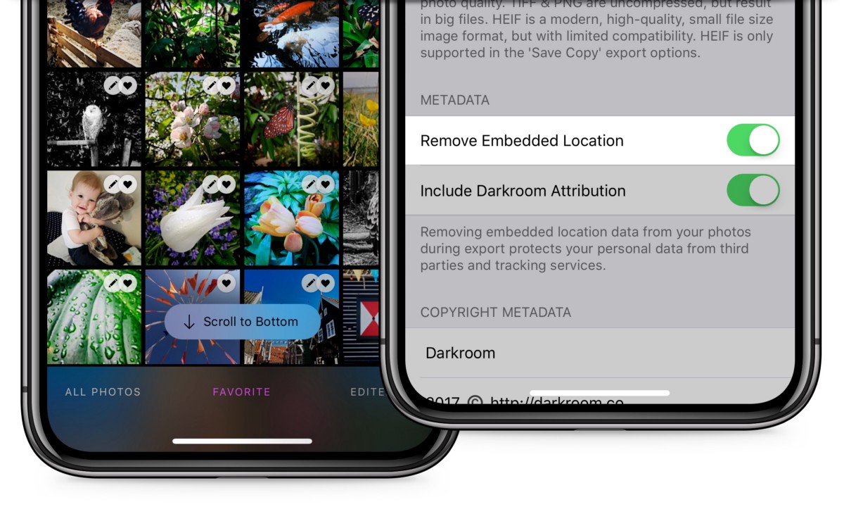 Inspired by recent debate around online privacy, and specifically Halide’s embrace of increased privacy in the context of mobile photography, Darkroom 3.6 adds a setting to enable and disable the embedding location information when exporting photos. That way location can be maintained privately on your phone for captured photos, but can be removed when sharing to third party platforms to prevent tracking.