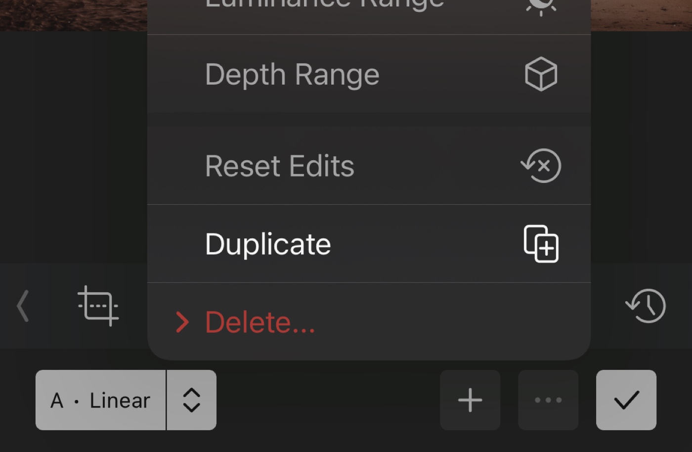 Say you have a Radial mask precisely positioned and set, and you want to use that exact same mask but also want some edits on the inversion of it, but without having to try and manually match it — you can! In the mask options menu found by tapping the [•••] button in the Masks bar, when a mask is active, you will find a “Duplicate Mask” option, just like you will find the “Invert” option there for a Radial mask.