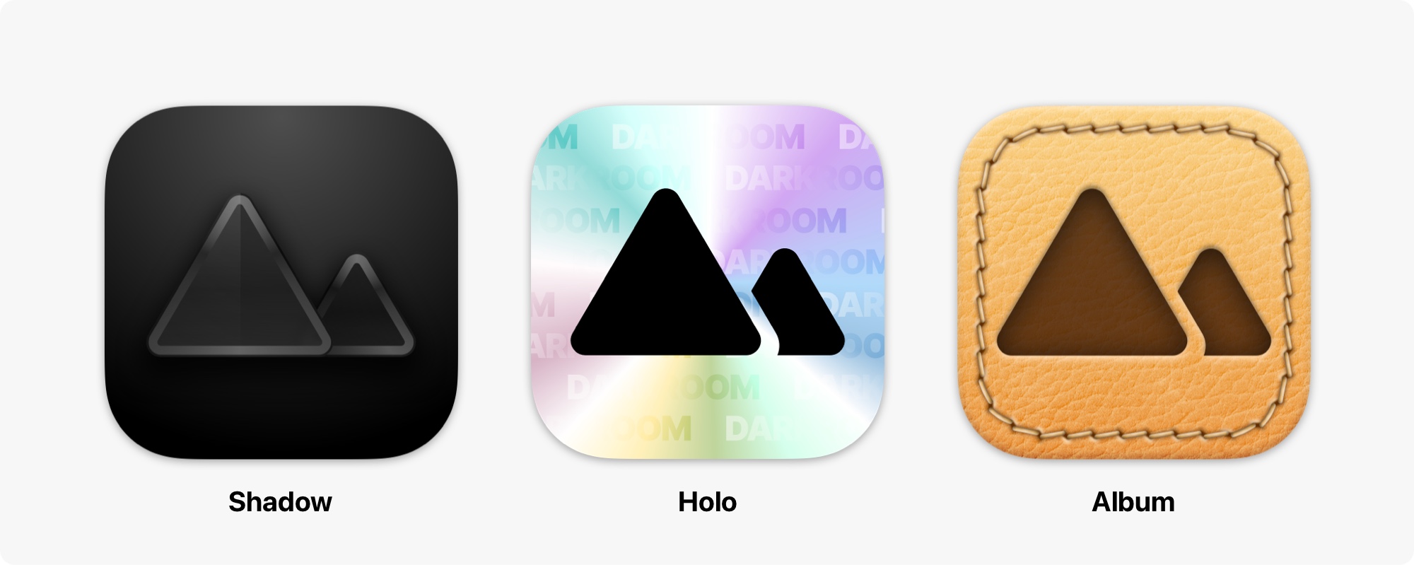 We added 3 new app icon variants, available to our Darkroom+ subscribers. Shadow provides a dark on dark version of our current icon, a wink to our impressive shadow recovery. Holo is the bright variant, to balance out the dark. And the Album option harkens back to skeuomorphic heydays off icon design. Bringing the total number of icons to choose from to a whooping 30!