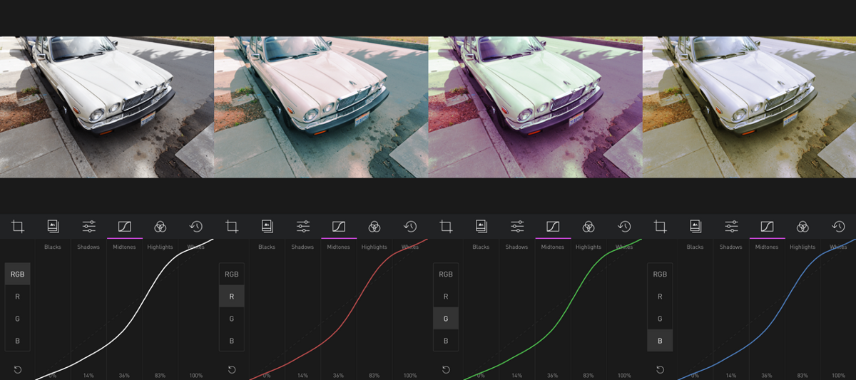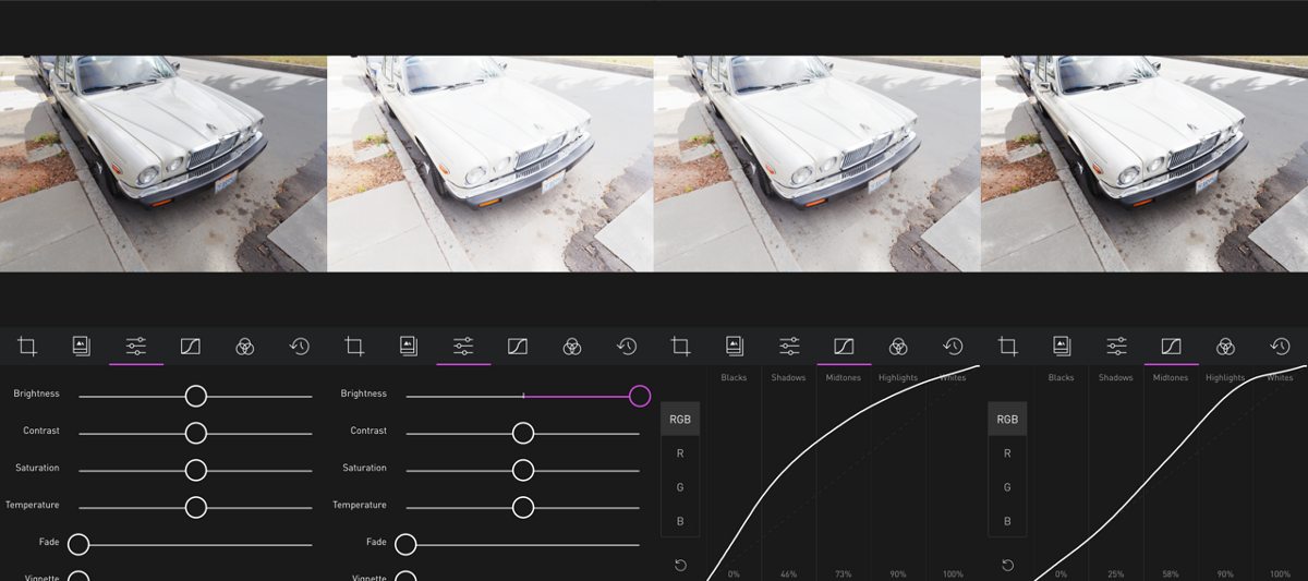 The story of Curves goes back to the earliest days of Darkroom. I grew to love what certain filters on VSCO where doing to my photo, but they weren’t perfect, and my process involved multiple apps and compromises to get the look I wanted. I decided to build an app to automate that process. After a few failed attempts at figuring out what was giving the filter its unique qualities, I stumbled on tone curves, began experimenting with them in Lightroom, and was awe-struck at the power and expressiveness of those lines.