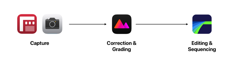 In a more professional context that requires more specialized tools, we recommend capturing videos using the excellent FiLMiC Pro app, then using Darkroom to cull down the media to a few selects, color correcting & grading them, then using LumaFusion to sequence the videos into a final product.