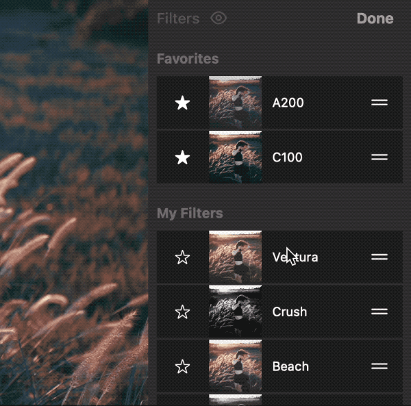 Favorite the presets you love the most, whether your own, or one of ours. To favorite a preset, tap the ••• button, or right click on the preset to access the favorite button. For multiple presets, the new Manage interface, allows you to quickly favorite as many as you like. Favorite presets always appear first in your list.