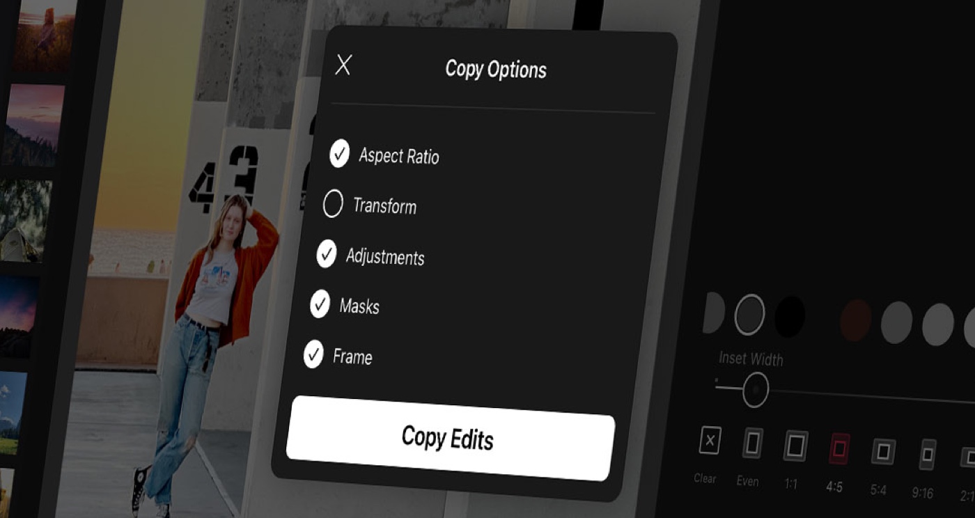 By default when you copy edits we only copy your base adjustments (applied preset, adjustment sliders, color and curve edits). We also have the ability for you to explicitly control which edits (aspect ratio, transform, adjustments, masks, frame) you want to copy and paste. This allows you to only copy a frame and its color, only the crop aspect ratio, just the edits, or any combination. Giving you even more powerful control over the consistency of your shoot in your Batch workflow.