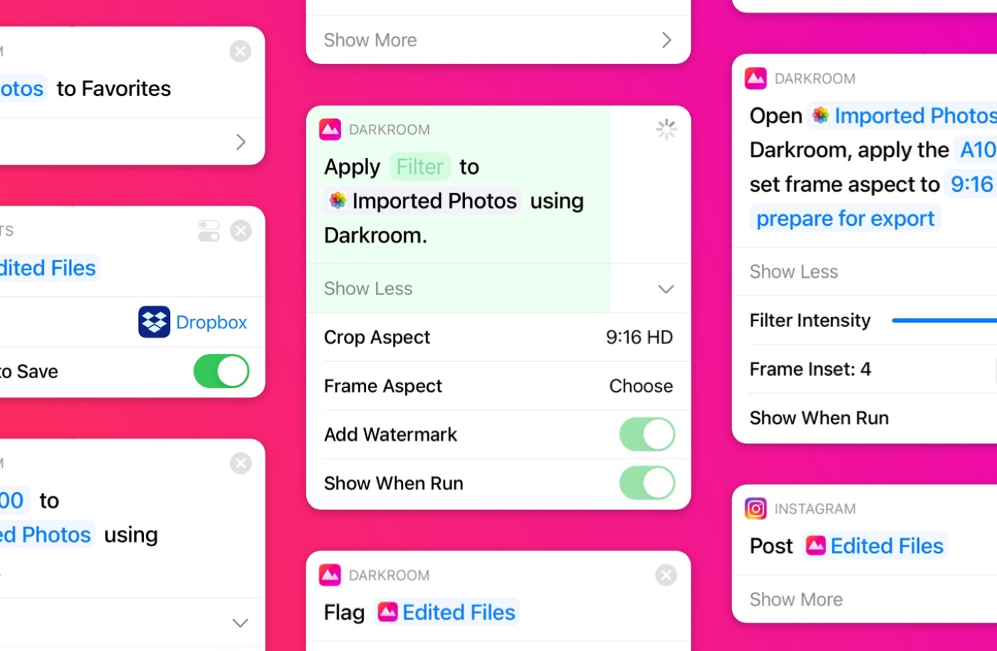 Our Darkroom Shortcut Actions, for the Apple Shortcuts app, enable you to take photos as an input, edit them, and save them to your library or pass them along to another action. You will be able to add a preset, set the preset intensity, inset on a frame, crop to an aspect preset, and add your watermark to every photo or video processed. From there, you can save it out to a Files folder, upload to Instagram, you name it. Learn More →